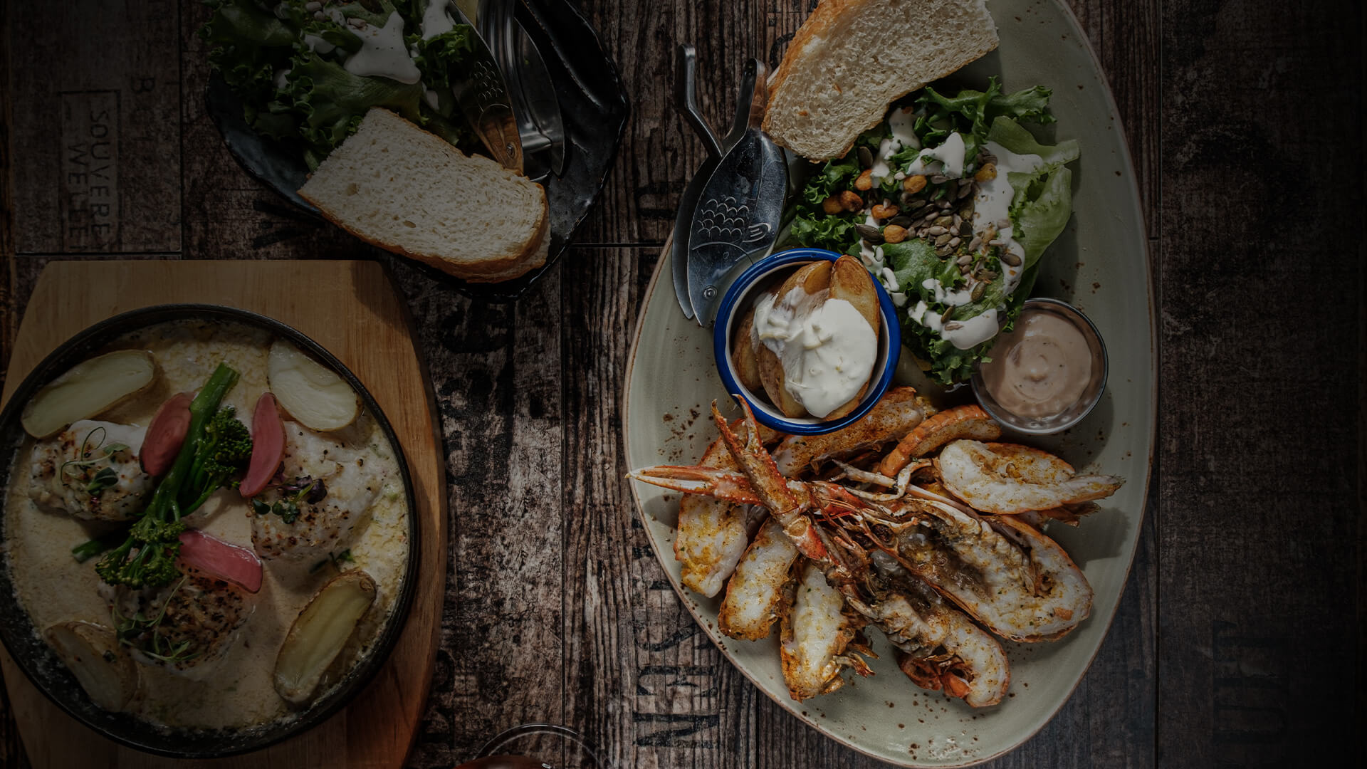 Langoustine tails and whole langoustine (300gr) baked in a creamy white wine sauce, served with a side salad, potatoes and bread.